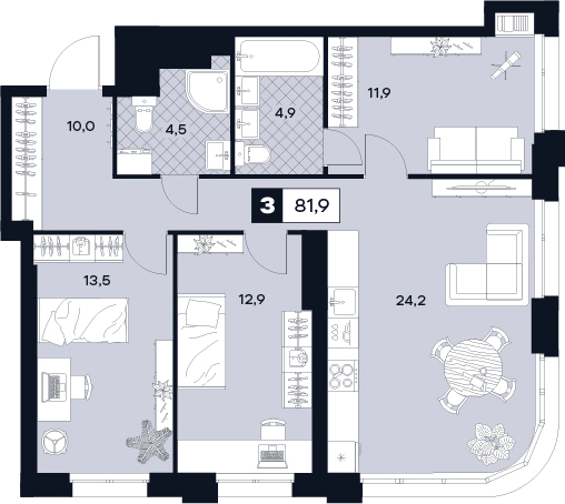 3-комнатная 91.3 м2