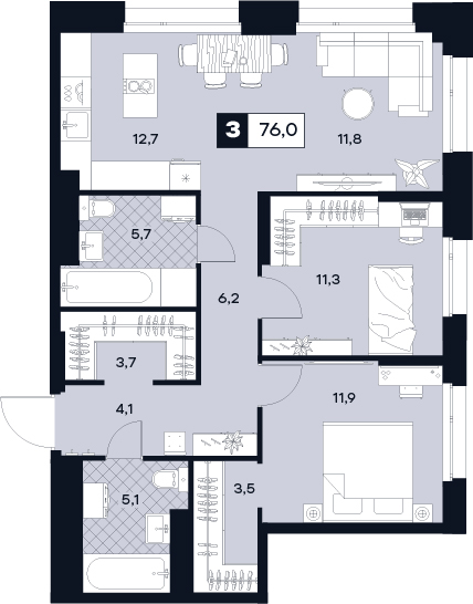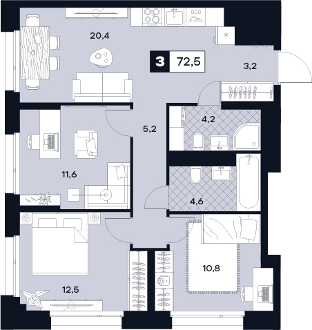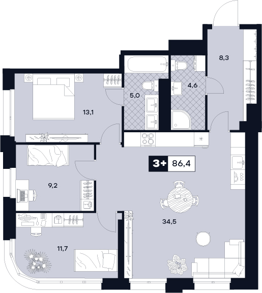 3-комнатная  90.6 м2